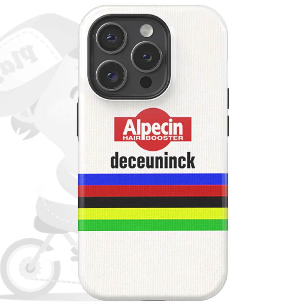 Alpecin-DeceuninckのMathieu van der Poelが2024年にシクロクロス世界チャンピオンになったことを記念して発売されたiPhoneカバーです。